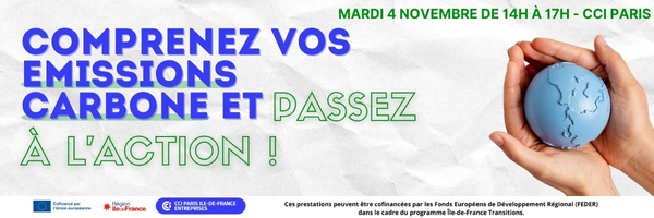 Le mardi 4 novembre, de 14h à 17h, la CCI Paris vous invite 2 Place de la Bourse à un événement entièrement dédié à la compréhension et à la réduction des émissions carbone des entreprises. Gratuit et ouvert à toutes les TPE et PME, cet après-midi est financé par le Fonds européen de développement régional (FEDER).